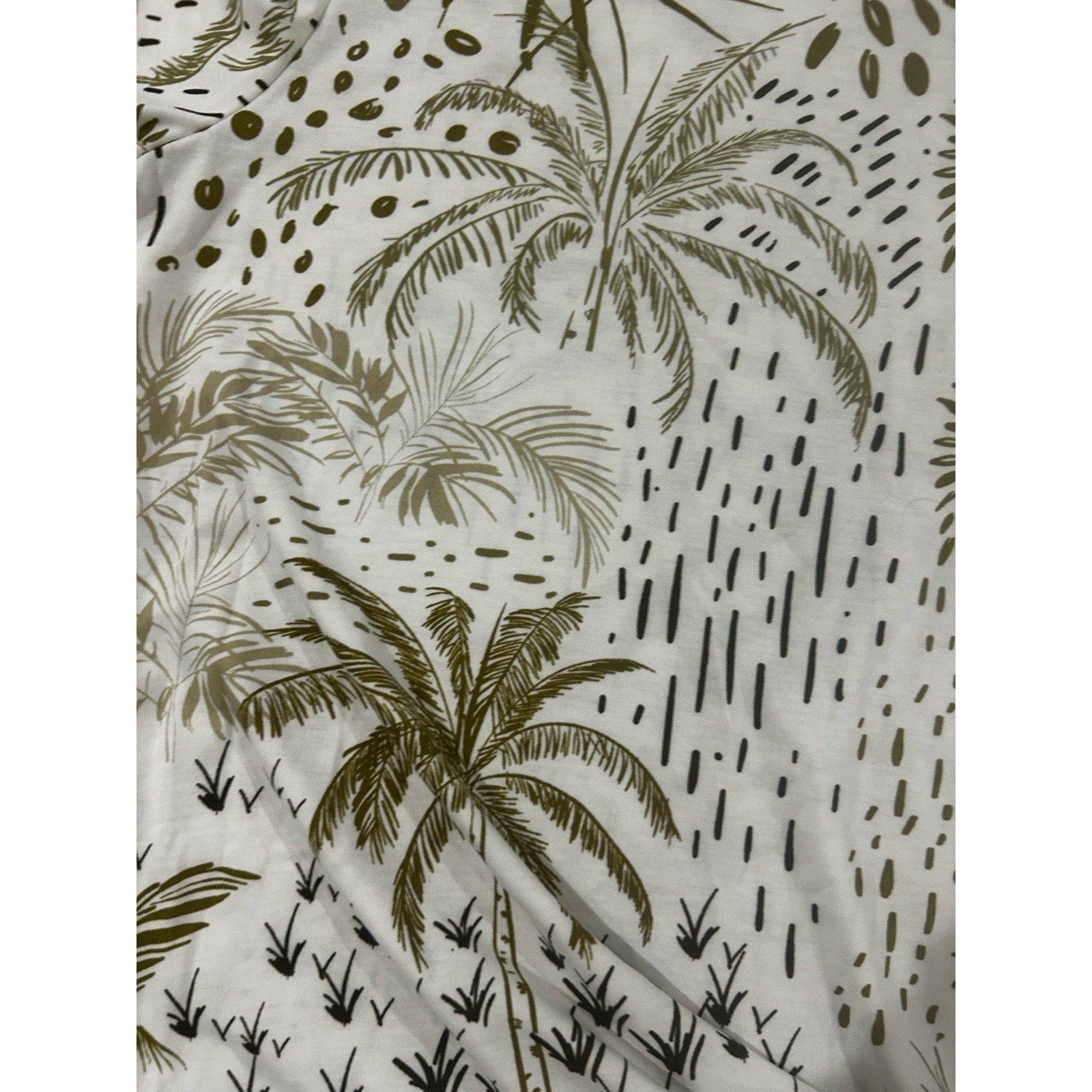 green neckline and sleeve edges, white background with green palm tree and elephant ear print